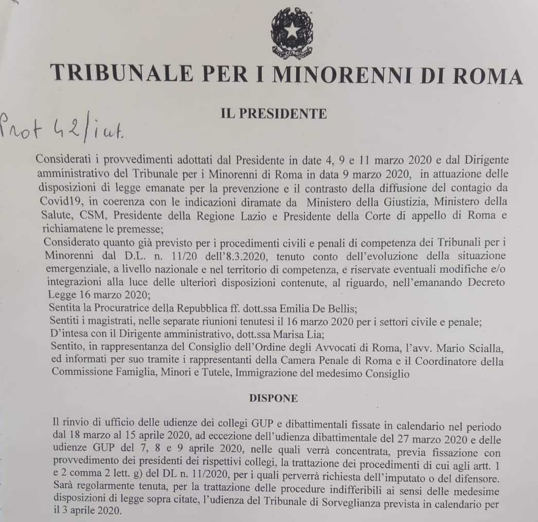 Vedi QUI il provvedimento del Presidente del Tribunale per i minorenni